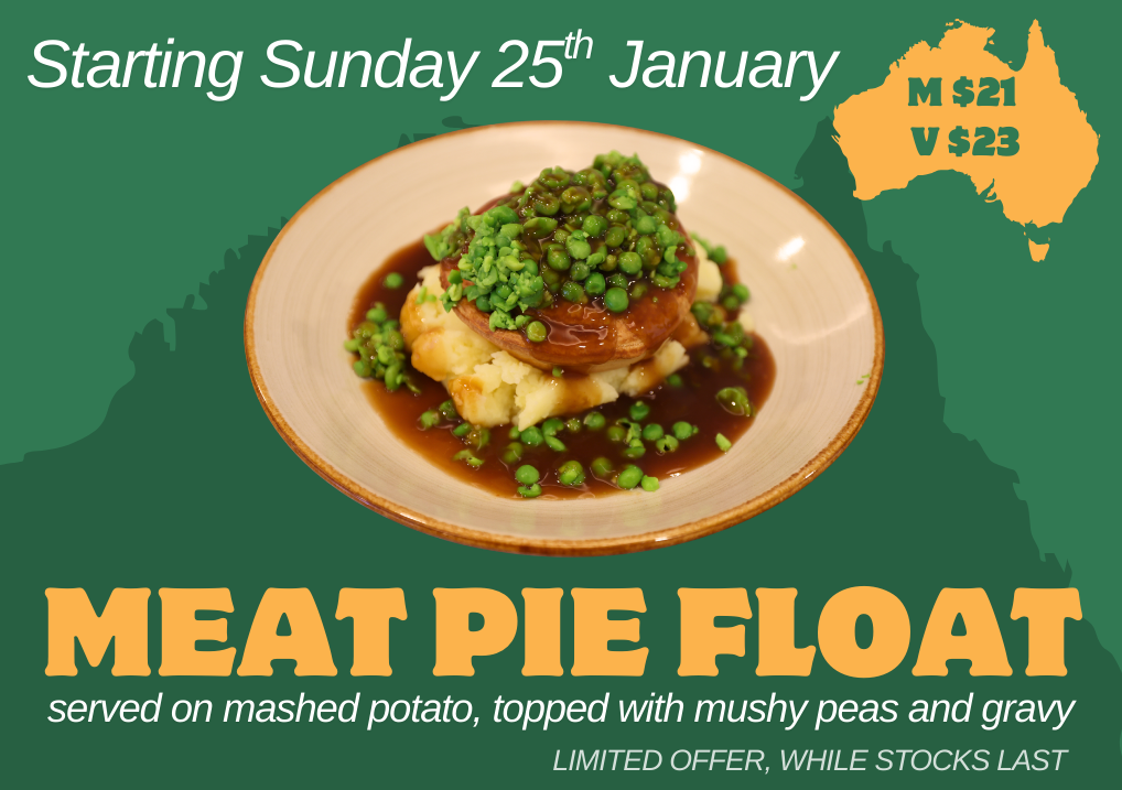 Celebrate the long weekend with some good food, including our special: Meat pie float! A classic meat pie served on mashed potato, topped with mushy peas and gravy.