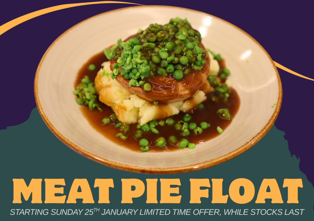 Celebrate the long weekend with some good food, including our special: Meat pie float! A classic meat pie served on mashed potato, topped with mushy peas and gravy.