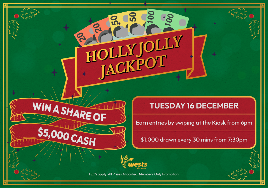 Members can win a share on $5,000 CASH on Tuesday 16th December. Draw begins from 7:30pm