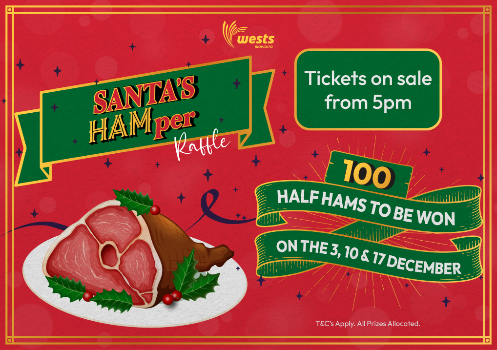 300 half hams to be won over 3 big nights! On 3rd, 10th, 17th December – Raffle tickets on sales from 5pm